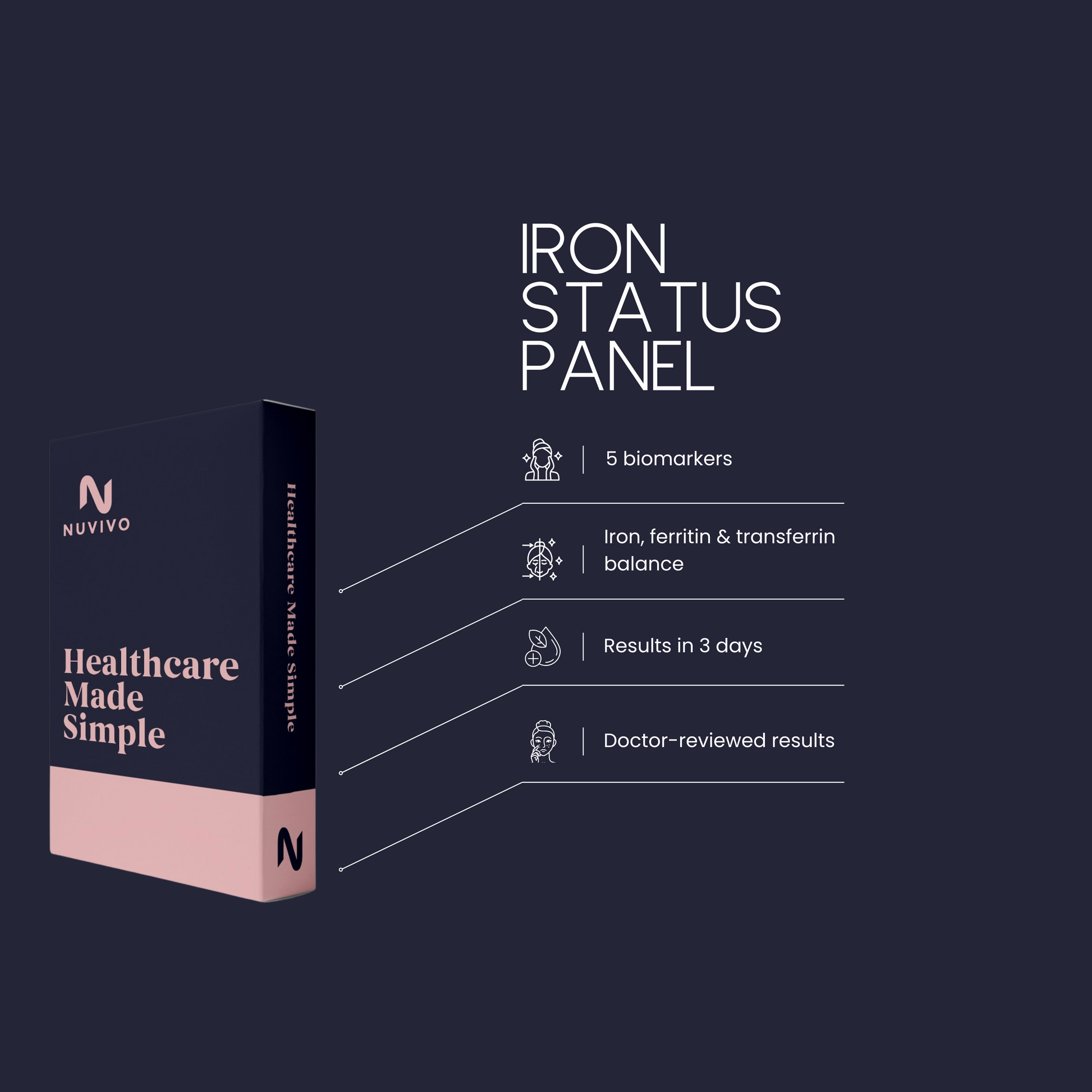 A focused iron health check covering iron, storage, and transport markers. This panel is designed to help detect iron deficiency, anaemia risk, or iron overload, supporting energy, oxygen delivery, and overall wellbeing.